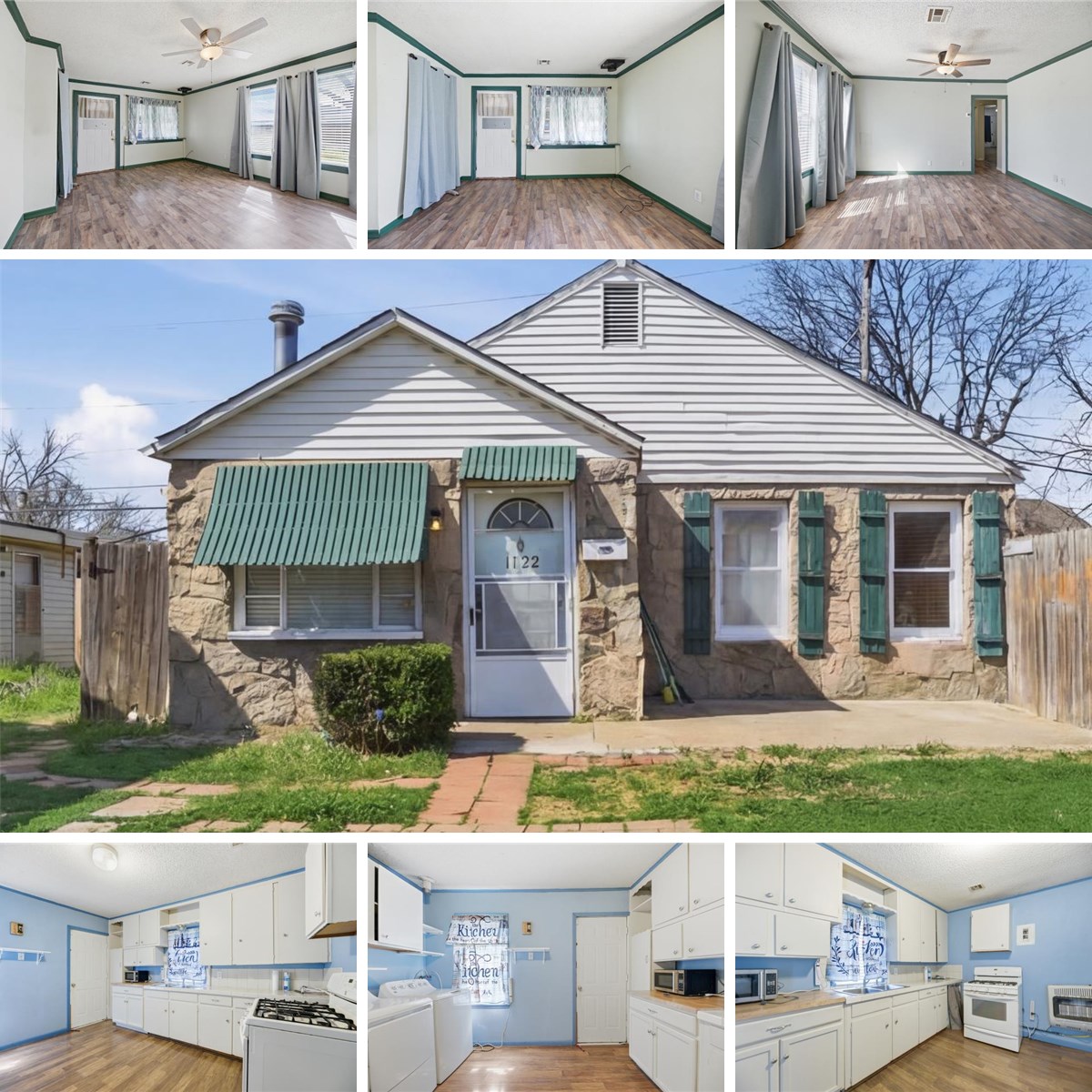 Charming 2-bedroom, 1-bath ranch-style home offering approximately 832 square feet (per tax records) on a 4,600 sq ft lot. The home features wood flooring in the living room and kitchen, with living room flooring installed less than one year ago. Bedrooms are carpeted. The kitchen offers ample cabinet storage and includes a refrigerator, stove, microwave, washer, and dryer. Laundry is conveniently located in the kitchen. Central heat was installed approximately 5-6 years ago. Cooling is provided by window air conditioning units that remain with the property. Additional features include a fenced yard, driveway parking, and two metal storage sheds that stay with the home. Located in Tulsa Public Schools and situated near local shopping, dining, and amenities, including proximity to Mother Road Market. Buyer to verify square footage, schools, and all information.