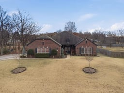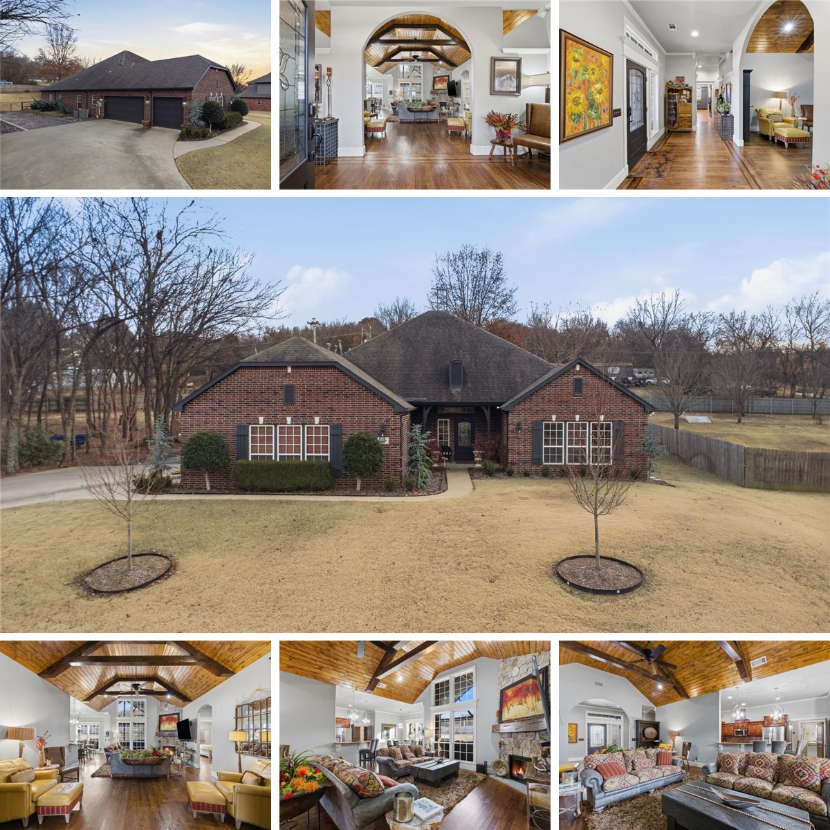 Designed for comfort today and flexibility for the years ahead, this beautifully maintained single-level home offers timeless style and thoughtful functionality for every stage of life. Nestled in a quiet neighborhood with exceptional access to major highways, this home blends peaceful living with everyday convenience just moments away. Designer finishes and quality craftsmanship are showcased throughout, including a stunning floor to ceiling stone fireplace and wood beam-accented ceilings that create a warm, inviting focal point. The home and bathrooms are handicap accessible, making it ideal for aging in place or multigenerational living, without sacrificing design or comfort. This highly functional floor plan includes 3 bedrooms, 2.5 baths, and a versatile second living area that could easily serve as a forth bedroom, home office, or flex space. Exceptional storage throughout, an incredible laundry room, filled with natural light, a sink and built in cabinets, even space for an extra refrigerator or freezer. The spacious 3 car garage is split with a wall and door closing off the 3rd car, making it ideal for storage or lawn mowers to be concealed. The built in shelving in the garage also add to the home's everyday ease. Situated on approx. 0.70 acres, the property is professional landscaped and equipped with an irrigation system and leaf-guard gutters. meticulously cared for and move-in ready, this home offers space, accessibility, and peace of mind in a setting designed to grow with you.