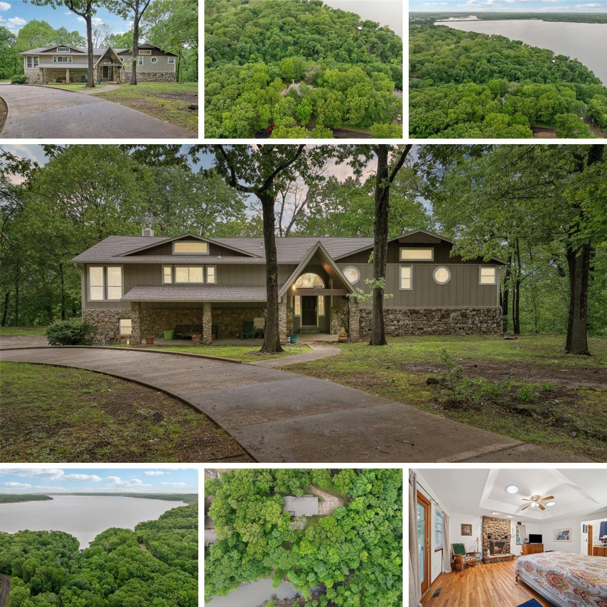 Nestled on a private wooded bluff overlooking Lake Hudson, this exceptional waterfront retreat offers tranquil seclusion and direct access om a dock approved cove. The home boasts panoramic views from nearly every room, especially the wall of arched windows in the great room and the spacious screened-in balcony-- perfect for enjoying sunrise coffee or sunset gatherings. The thoughtfully designed kitchen features custom oak cabinetry, ample counter space, double ovens, a gas cooktop island, and a large pantry. Natural light pours into the breakfast nook through picture windows, providing peaceful forest and lake views. Just off the kitchen, the open-concept living area includes a fireplace and built-in shelving, creating a cozy yet functional space. The wetbar with icemaker will add to the ease of entertaining family and friends for those long holiday weekends and special events. The oversized primary suite offers hardwood flooring, a rock fireplace, private deck access, a walk-in closet, dual vanities, a walk-in shower, and a jetted tub. Downstairs, the walk-out basement includes a second living area with a fireplace, full bath, two additional bedrooms, and flex spaces ideal for guest quarters, office, hobby room, or storm shelter. Three full garage bays and a circular drive provide ample parking and storage for lake toys and outdoor gear. There is also a small shed for all the yard tools and floaties that won't fit in the garage. Whether you're looking for a weekend getaway or a forever lake home, this one offers both peace and practical function in a wooded waterfront setting. Located just minutes from Lake Hudson recreation areas, this is Oklahoma lake life at its best.