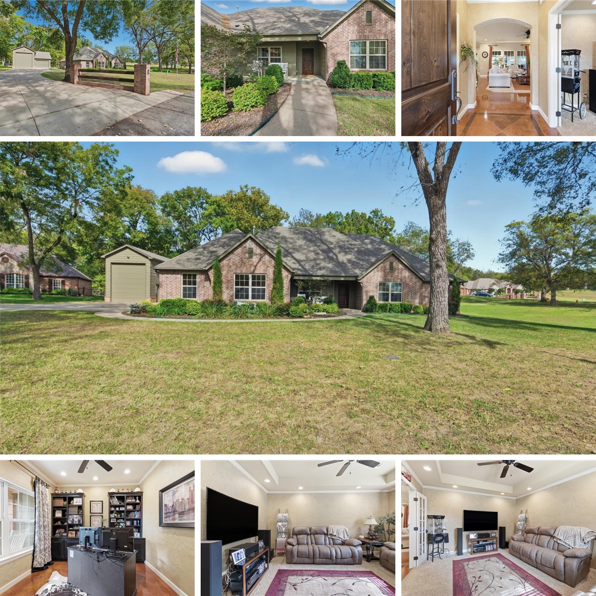 Discover timeless elegance and modern comfort in this stunning 4-bedroom, 2-bath French Country home. Set on just under an acre, this property offers a peaceful, park-like setting surrounded by mature trees and a serene wet-weather creek. Inside, you'll find beautiful stained concrete floors and granite countertops that blend style and durability. The spacious covered rear deck is complete with retractable shades that offers year-round outdoor enjoyment and is perfect for entertaining. A 2-car attached garage provides convenience, and the oversized detached shop offers plenty of room for hobbies, storage, or even an RV. This one-of-a-kind property combines country charm with modern amenities, an ideal place to call home only a few minutes from Skiatook Lake.