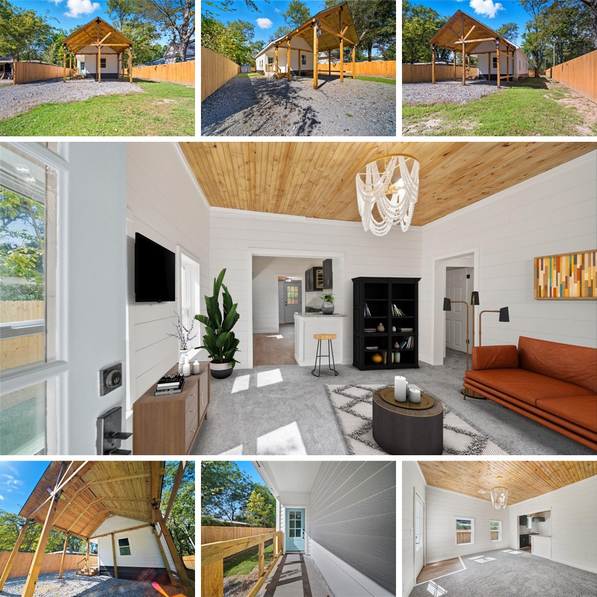 Charming 1950 Classic with Modern Farmhouse Flair describes this adorable home. This beautifully renovated 2-bedroom, 1 bath home is loaded with personality & style. Thoughtfully updated inside and out, it features a seamless blend of timeless charm and modern farmhouse finishes. Throughout the home, you'll find striking black and gold fixtures & brand-new windows and doors, and a fresh roof along with central heat and air for year-round comfort. The stunning kitchen and bath have been completely redone, boasting today's must-have features while keeping character at the forefront. You will love the new wood ceilings installed in most of the rooms and the shiplap siding that gives it today's modern flair. A spacious laundry room with a pantry/storage area adds functionality and convenience. Step outside to enjoy a brand-new deck and a freshly installed privacy fence to allow for outdoor living and entertaining and a new carport with a vaulted roof to keep you out of the elements. This move-in ready gem truly has it all - character, updates, and the perfect mix of classic and contemporary. The newly enclosed laundry room is not reflected in the reported sq ft of the home.