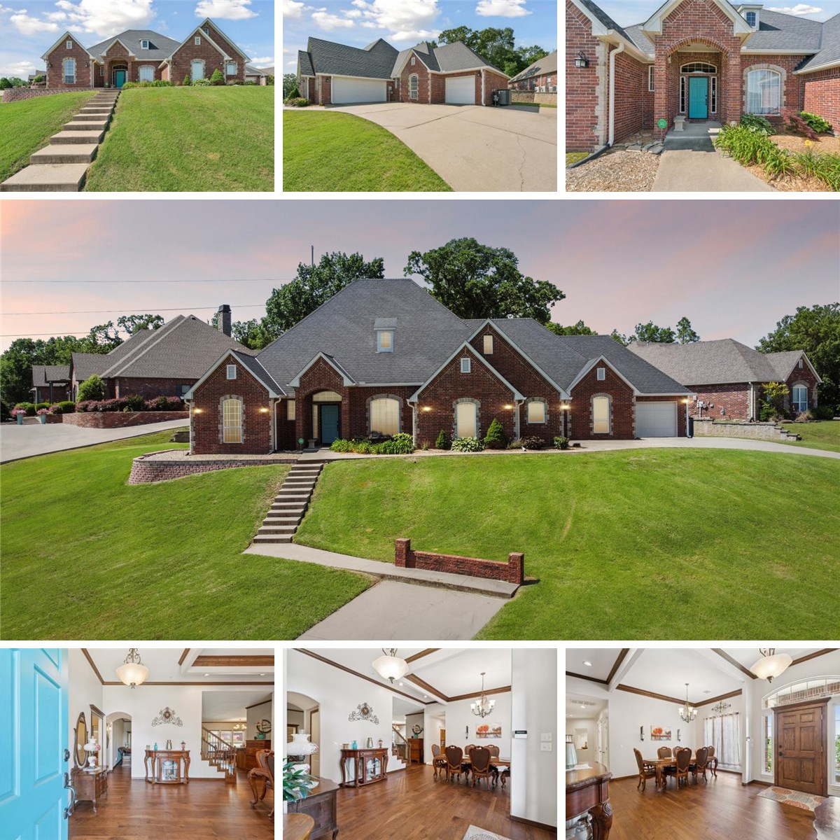 All bedrooms are conveniently located on the main level. The spacious primary suite features a tray ceiling, wall of windows, private patio access, crown molding, and a luxurious bath with double vanities, whirlpool tub, separate shower, and a walk-in closet with built-ins. Two large bedrooms share a Jack & Jill bath, while a fourth bedroom includes its own en-suite full bath. A half bath is available for guests, and the inside utility room includes a sink for added convenience.