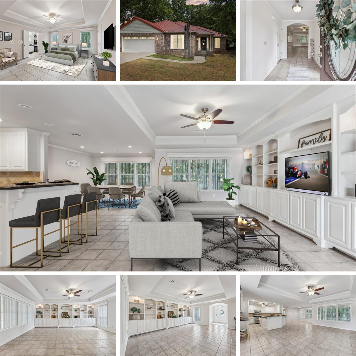 The spacious primary suite features tray ceilings, large walk-in closets, and a well-appointed bathroom with a jacuzzi tub. The climate-controlled garage is a standout, housing the water well and water filtration system within a dedicated garage closet, along with an underground storm shelter located beneath the garage floor and protected by a steel table built above the entry for added safety. The garage also includes workbenches, compressed air hookups, and TV hookups—perfect for hobbies, projects, or entertaining.