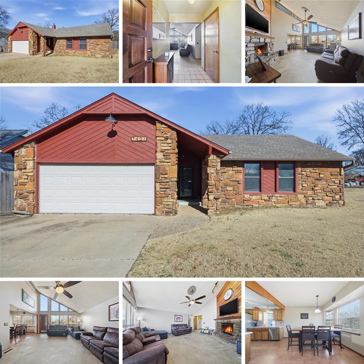 district of Berryhill. The living room features vaulted ceilings, large windows, and a striking stone fireplace, creating