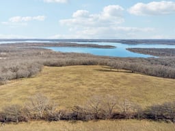 Level hilltop pasture and wooded hillside with pond